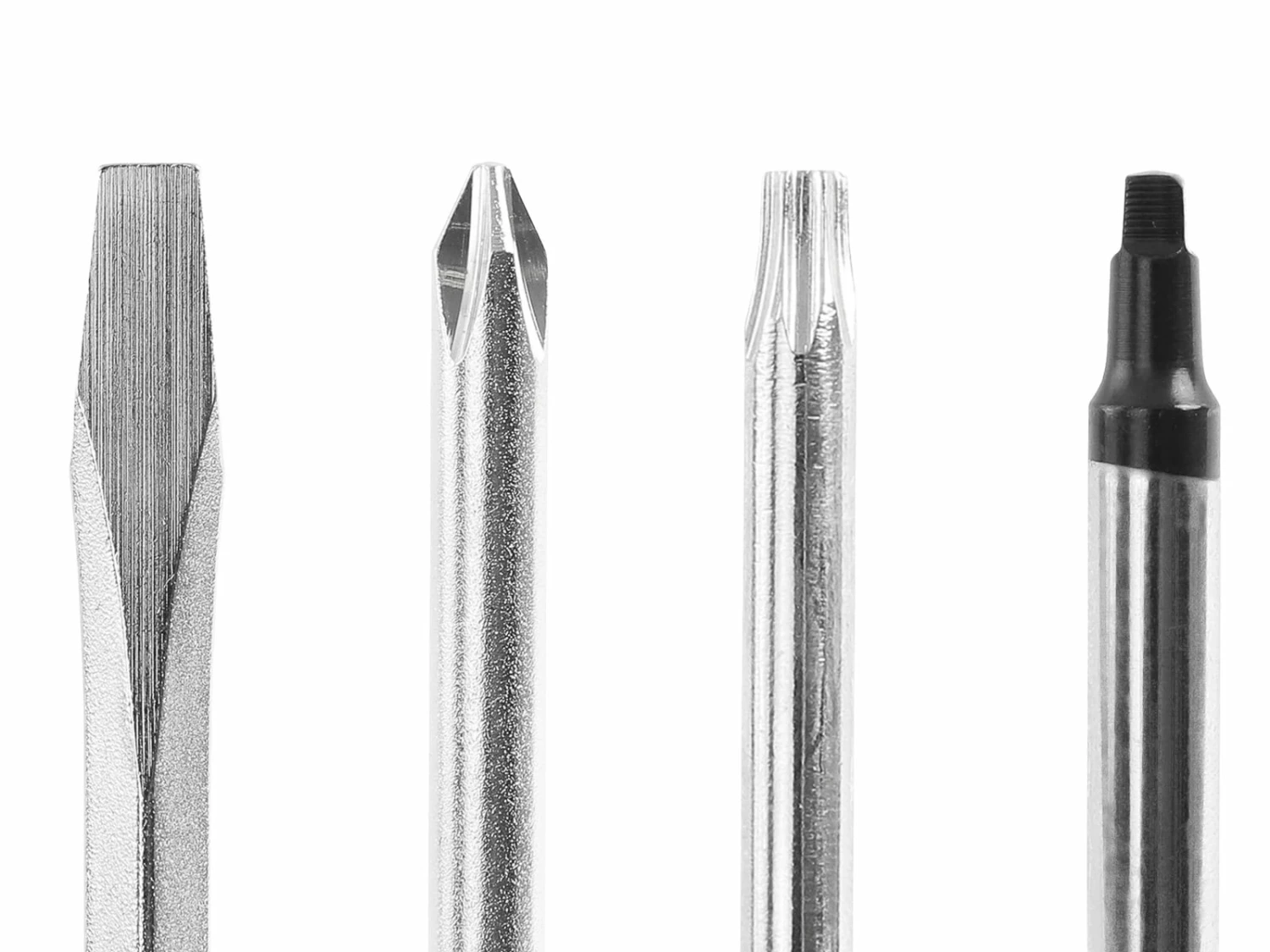 - 6 Phillips drive, 6 flat tips, 2 Torx drive, 1 square drive, 1 off-set, 3 hooks, and 1 pick