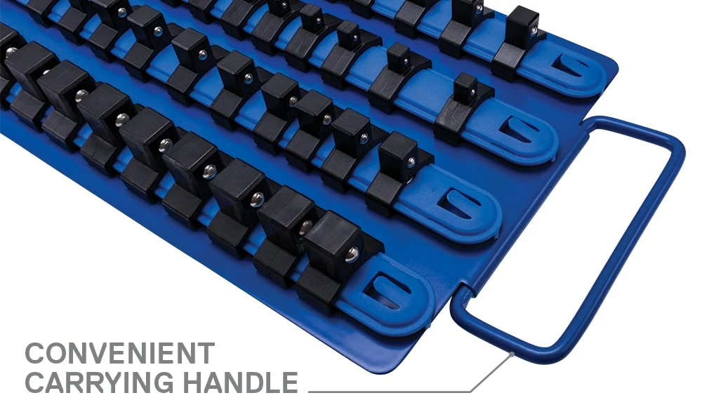 - Holds thirty 1/4-in, forty 3/8-in, and sixteen 1/2-in drive standard (SAE) or metric sockets