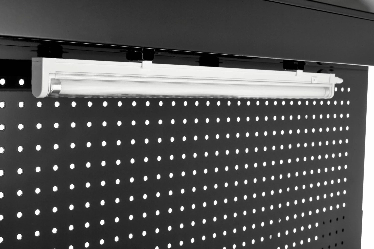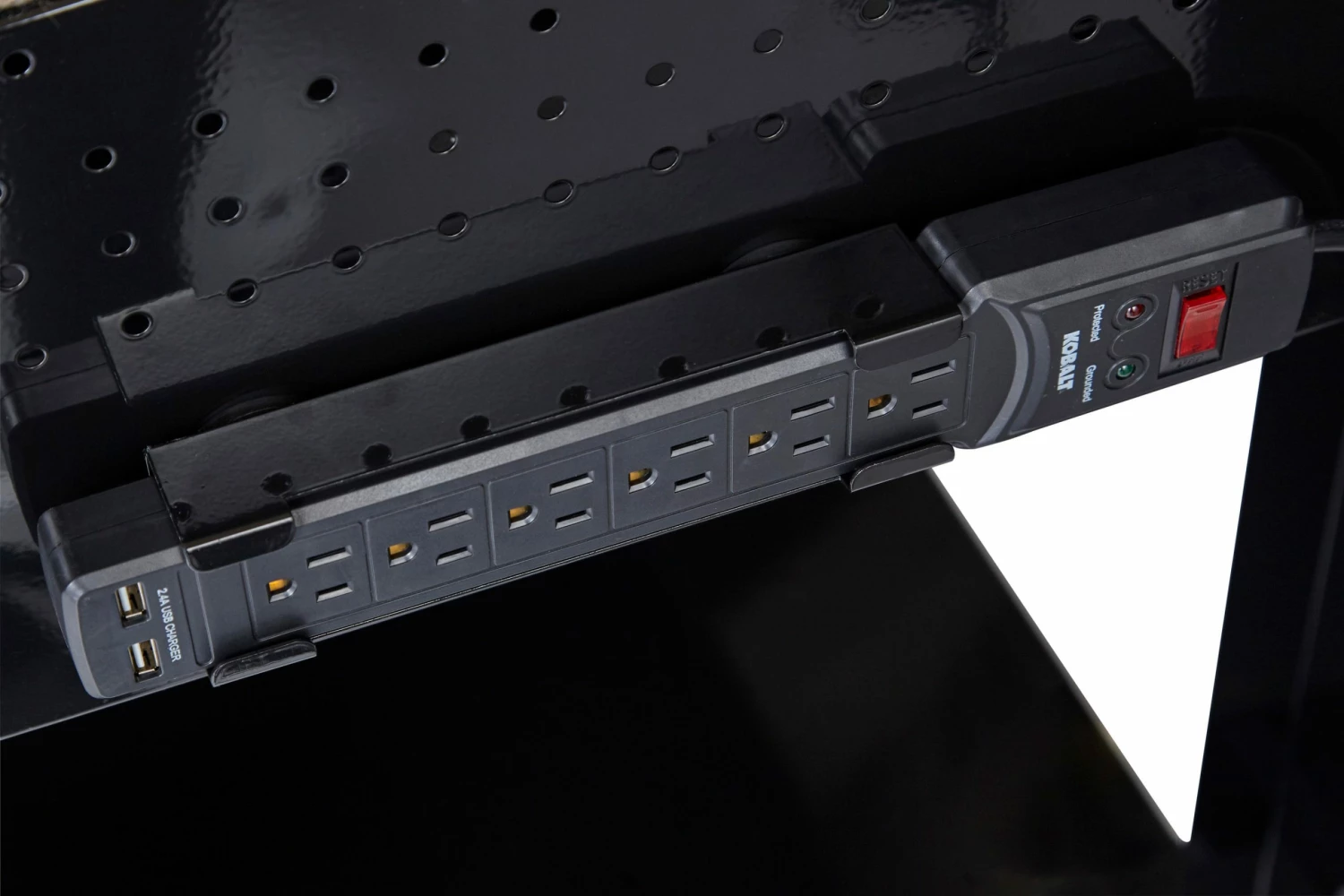 Give your garage, shop, craft space or workplace the extra storage and work space it needs with this Kobalt workbench. With its heavy-duty steel construction, it provides a sturdy place to tackle projects of all kinds, and has the ability to hold up to 1,100 lbs of tools, hardware and other accessories. Three drawers feature heavy-duty, ball-bearing slides so they are easy to open, and offer plenty of room for storing a variety of tools or accessories. Featuring a 3-receptacle power strip, you can conveniently plug in electric tools right at the bench, while 2 USB ports offer even more versatility. Keep your work space bright the florescent light bar and use the accessory hooks for more tools storage or a place towels. For a handy work surface and plenty of storage space, this workbench is the perfect choice.